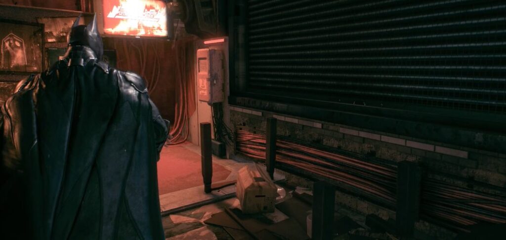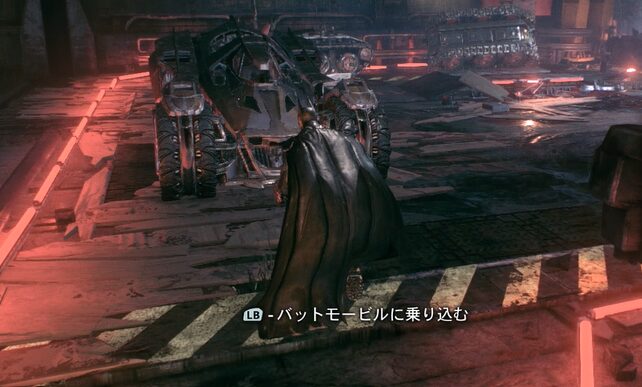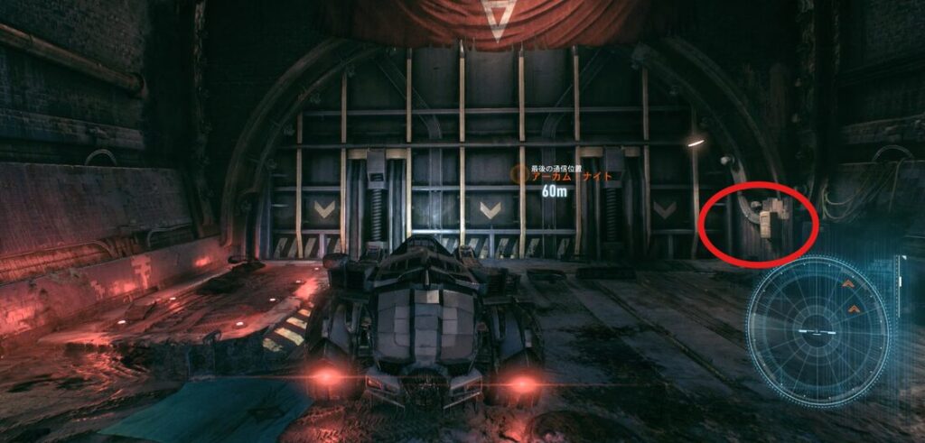 先に進むと扉が閉まっているので、一度バットモービルから降りて下図の赤丸の箇所を操作して扉を開けて先に進みます。