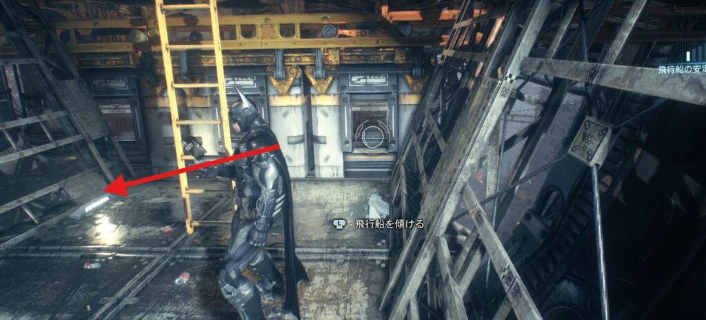 飛行船を手前に傾けて、タンクをどかしてハッチに降りられるようにする。