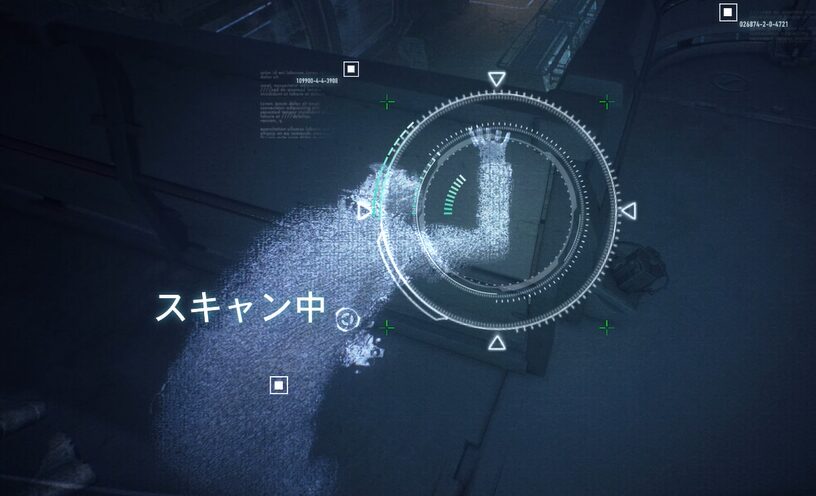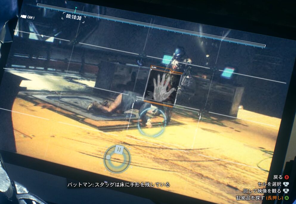 そのあとは、十字キーの上を長押しして証拠スキャナーでスタッグを見つけて手をスキャンし指紋情報を集めます。