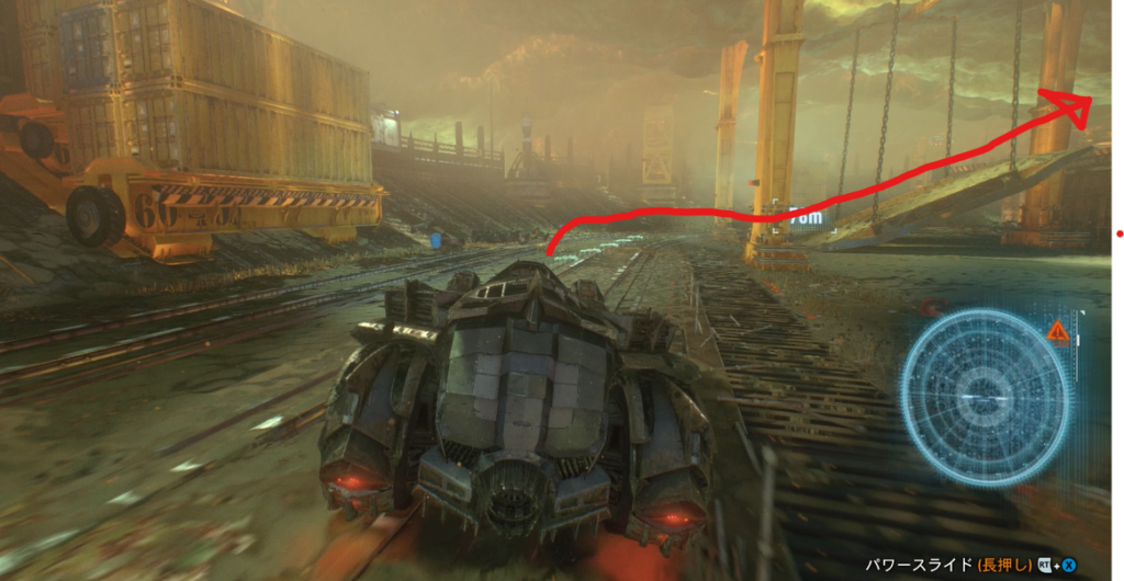 解除したら、バットモービルに戻りジャンプ台の反対側からバトルモードで登り、ジャンプ台が上がっている状態でバットモービルを停車させます。