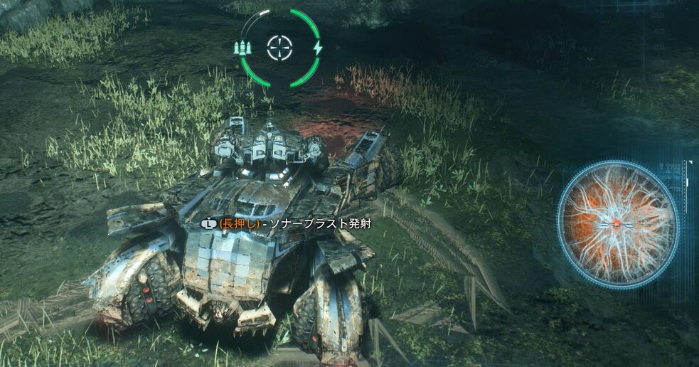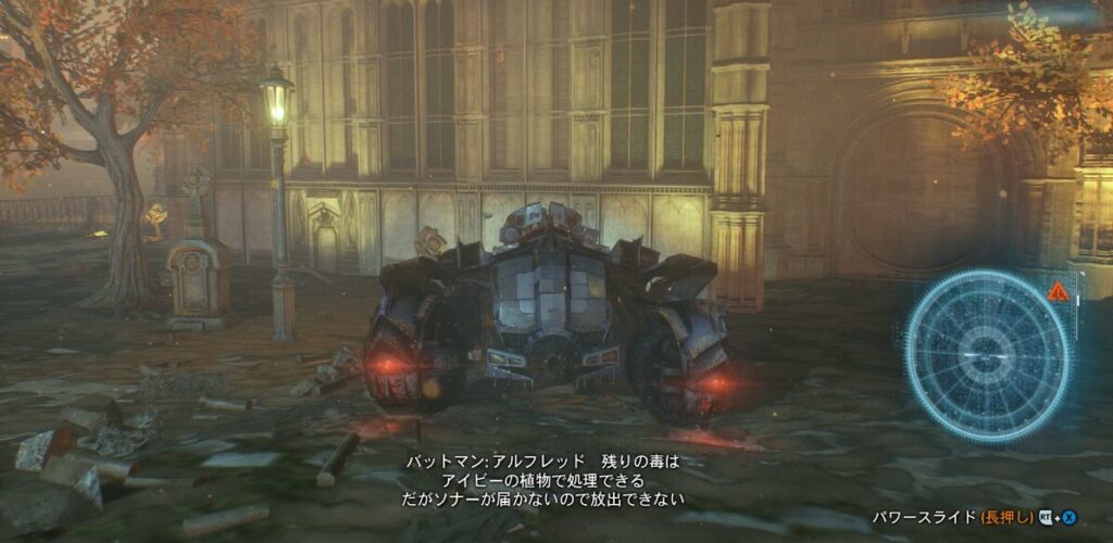 バットモービルで先に進み階段を登って、以下の箇所らへんでLスティック長押しでソナーブラストを発射して植物の中央を見つけて完了です。
