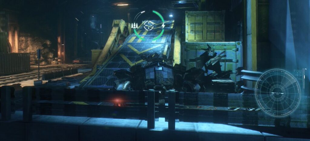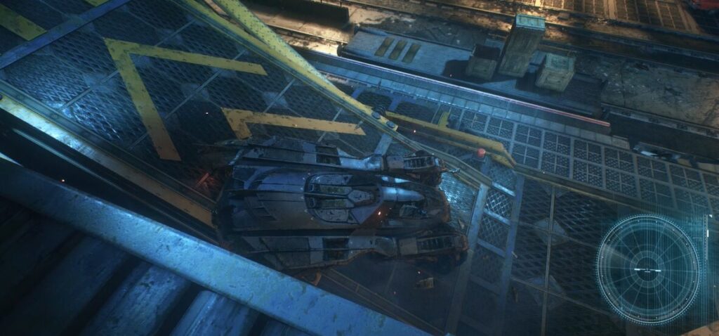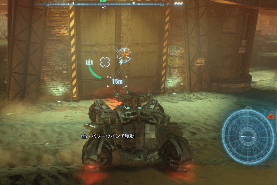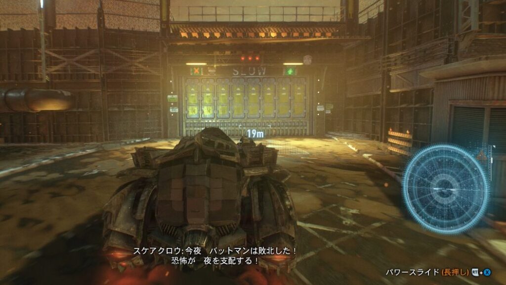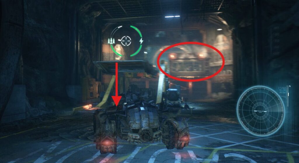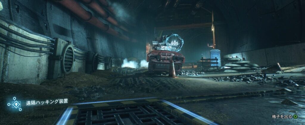 バットモービルから降りてグラップリングで制御室へ渡ります。端末を操作してロック解除します。