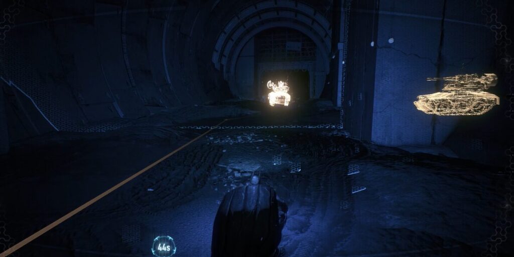 壁にある端末にアクセスしてバットモービルを中に入れリモートで操作し、ドローンを一掃します。