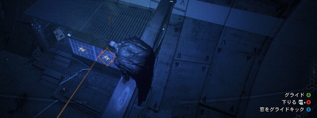 先に進んだら、グラップリングで上に登り、上から窓をグライドキックして部屋に入ります。