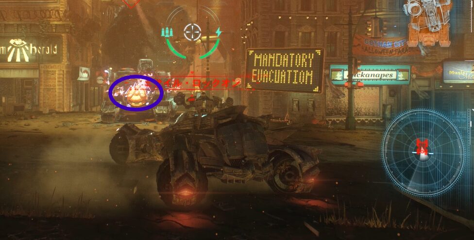 下図の『クラウドバーストオーバーチャージ』が切れるまでまたは、レーダーのクラウドバースト戦車が赤→オレンジに戻るまでとりあえずバットモービルを走らせ逃げます。