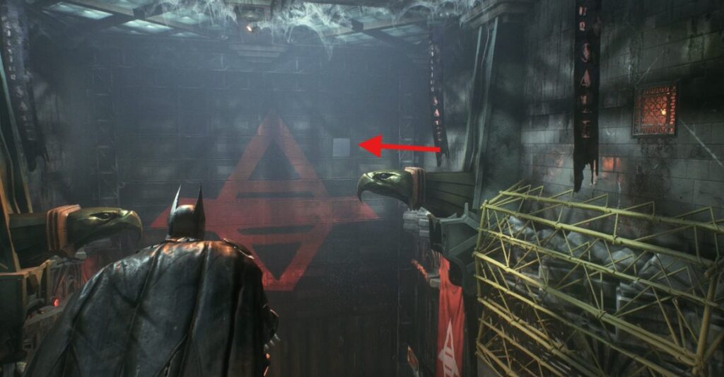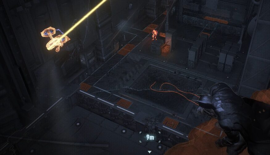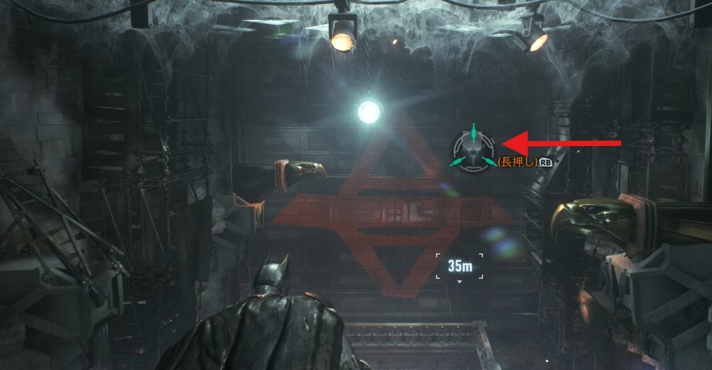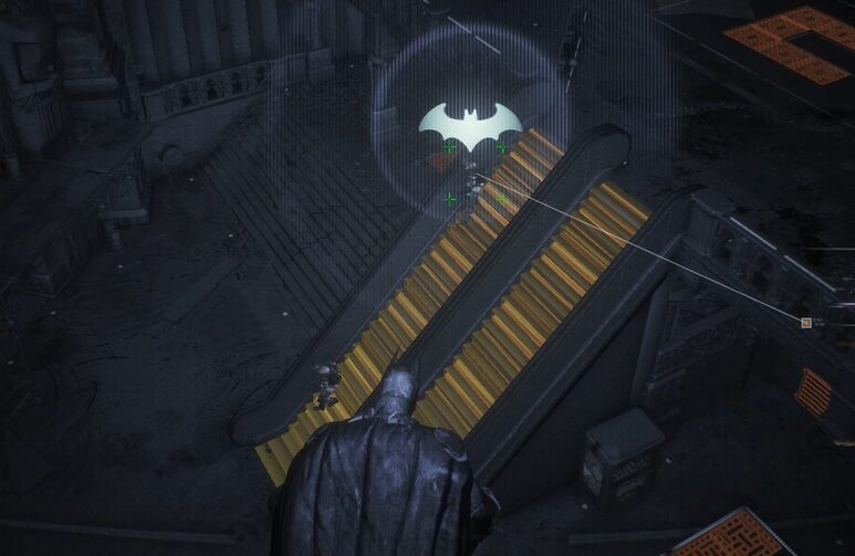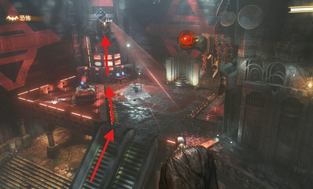1回目はアーカムナイトの銃のレーダーを避け、エスカレーターを上りアーカムナイトの下に行ってグラップリングで上に上がるだけです。