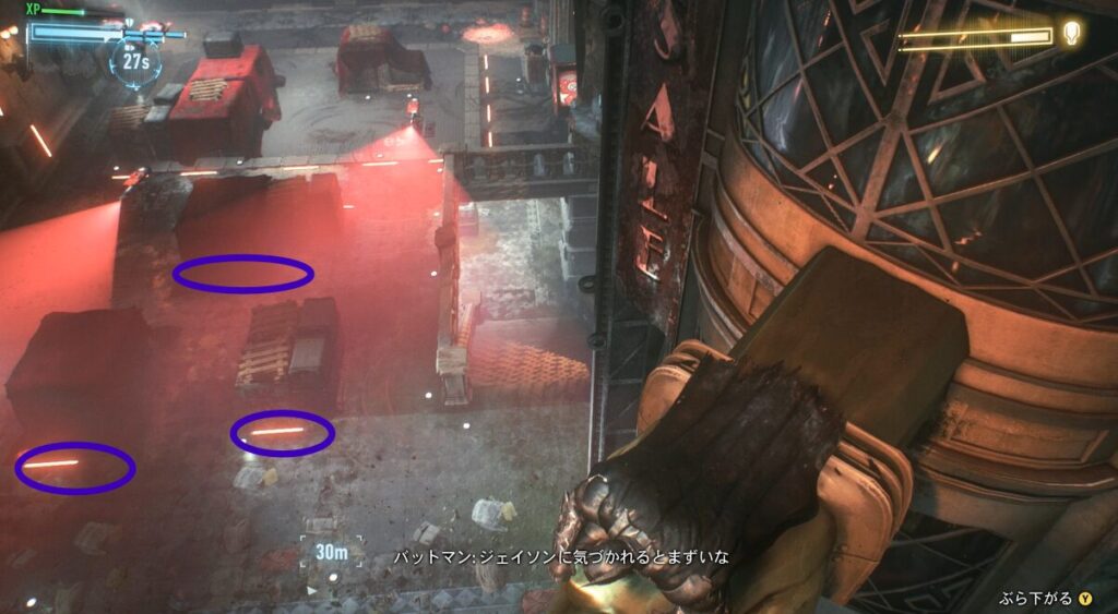 下図の青丸のところなどに隠れてセントリーガンのセンサーを避けて、アーカムナイトの真下に行きグラップリングでアーカムナイトの所に行きます。