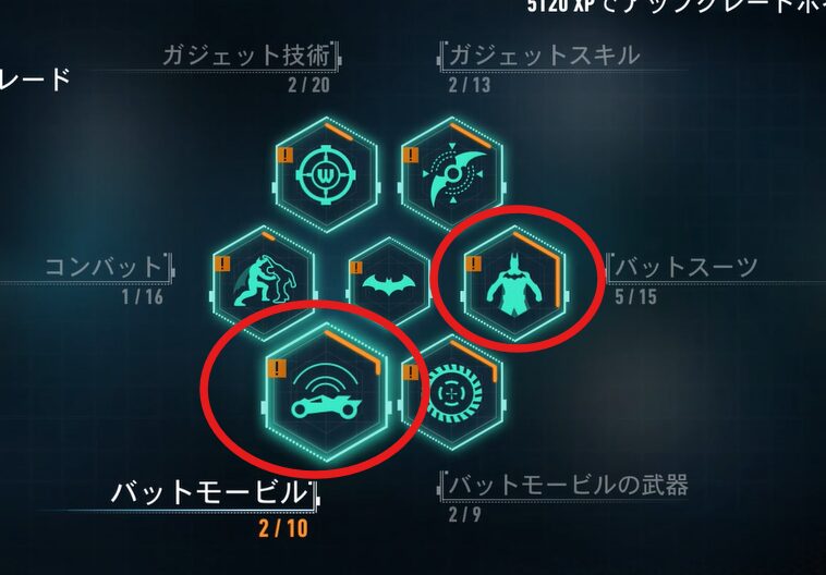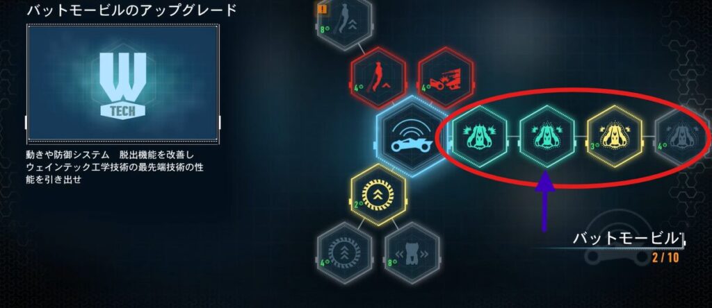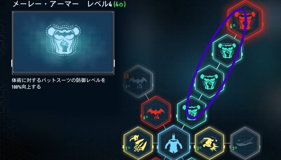 ストーリーがすすむにつれて、一度にたくさんの敵と戦うことが増えるので、体術に対するバットスーツの防御レベルを上げるのがおすすめです。