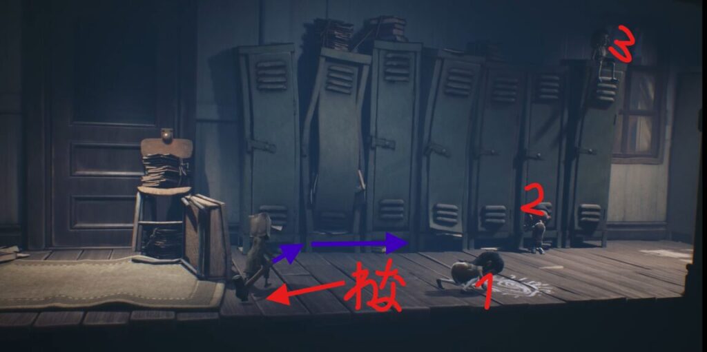 ロッカーからいじめっ子が出てくるので、1番→2番の順で倒す。