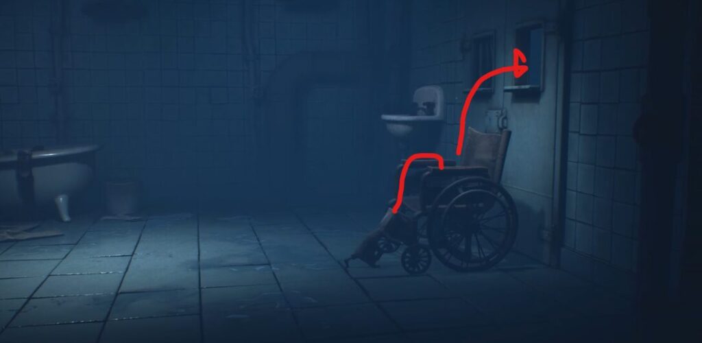 そしたら、奥の部屋の車いすに座っている人形が動き出すので、石鹸が置いてある部屋までおびき寄せてもう一度レバーを下げて電気をつけると、人形はライトを当てなくても停止します。