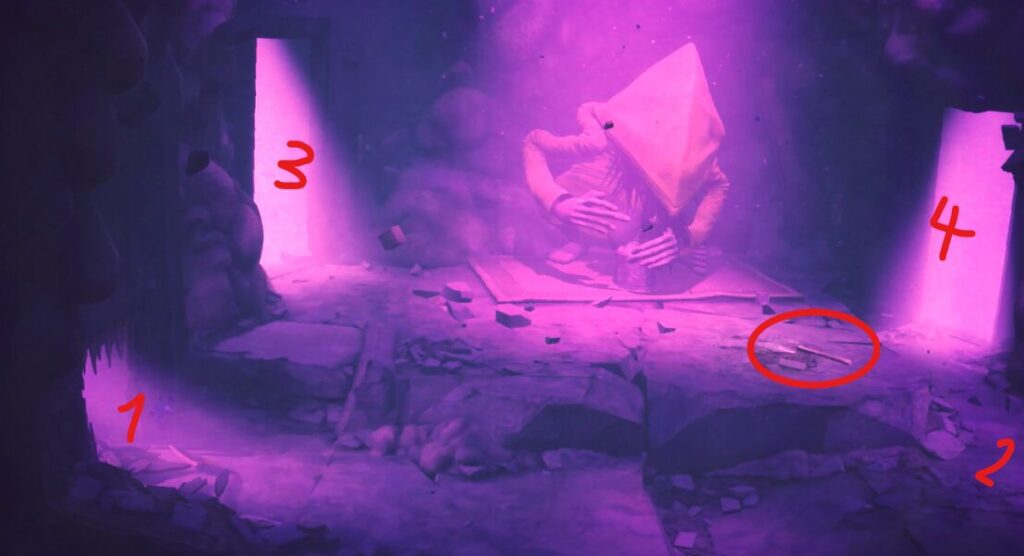 斧を取って巨大シックスを呼び、左に行って右から出て、オルゴールを斧で破壊する。