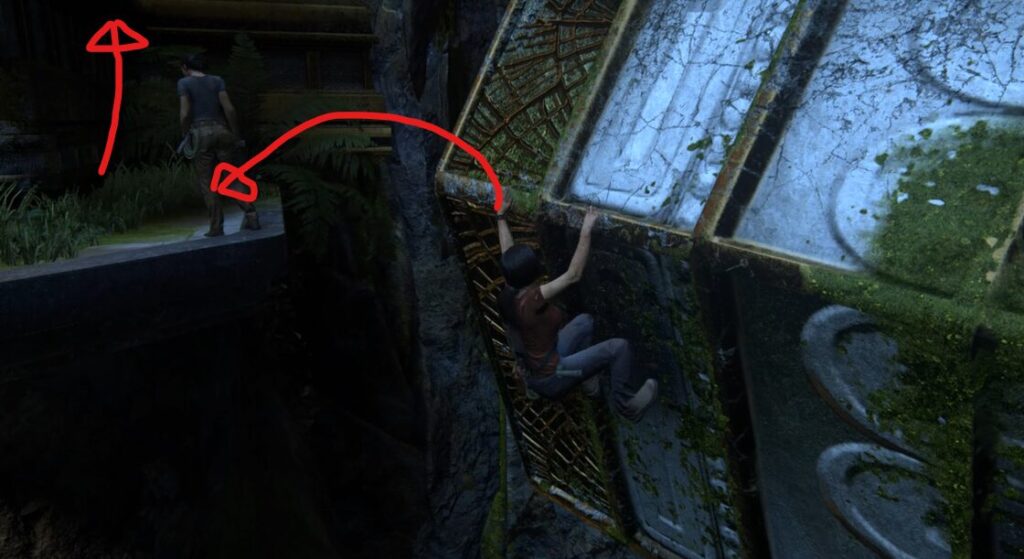左手側の壁を登っていくとギミックがあるので、ナディーンと一緒にギミックを動かすと上の左手と下の左手が動くので、下の左手→上の左手の太鼓に飛び移ります。