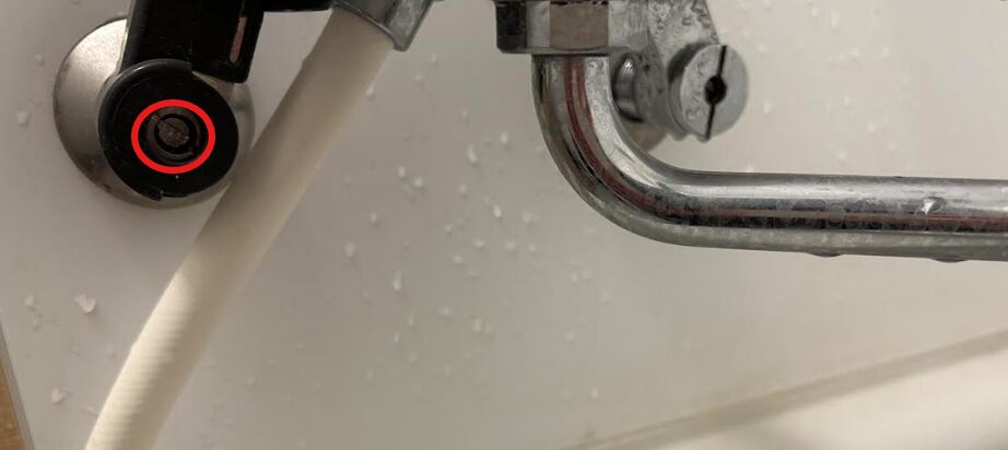 反時計回りに回すとお湯の流量が増えるので、お湯の水栓(以下の赤丸の箇所)をマイナスドライバーで反時計回りに回したら、お湯がでるようになりました。