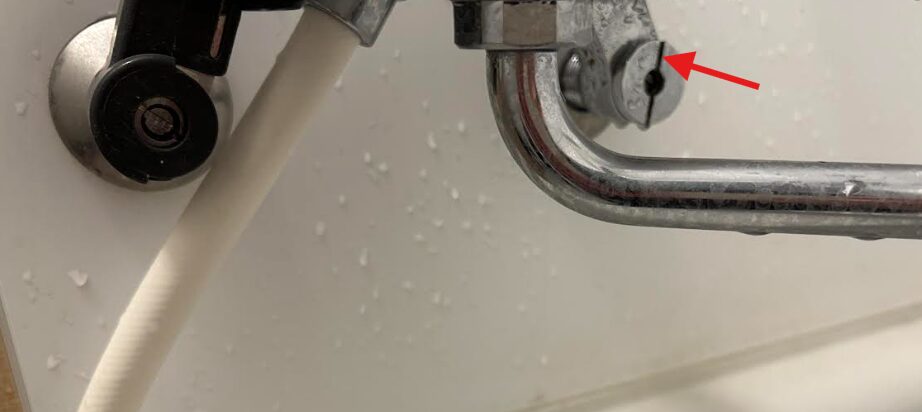 ※注意点として、赤矢印の箇所にマイナスドライバーを入れて水栓カバーを外してしまうと勢いよく水が噴き出すのでご注意ください!