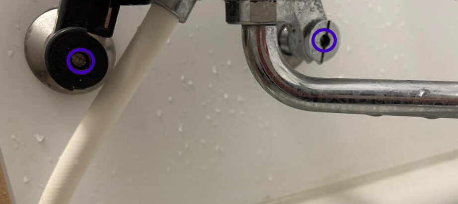 外す場合は右と左の流量調節栓(下の青丸)を時計回りに完全に閉めてから、外しましょう。
