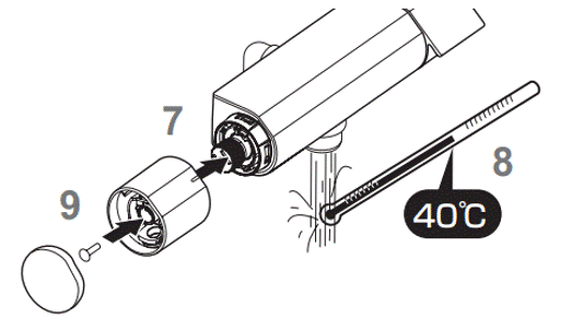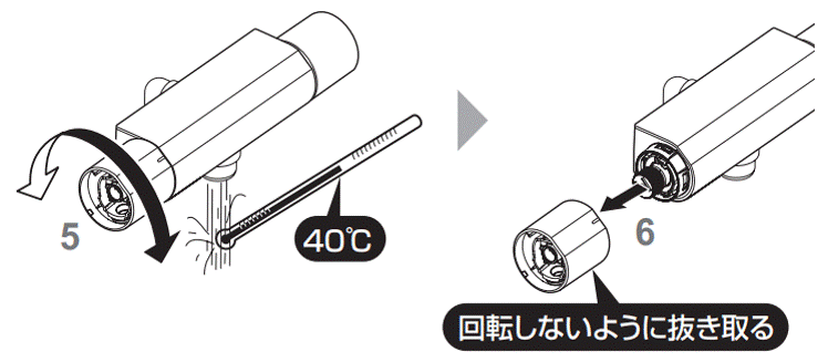 6,お湯を止め、温度調節ハンドルを抜き取る。7,温度調節ハンドルを取り付ける。