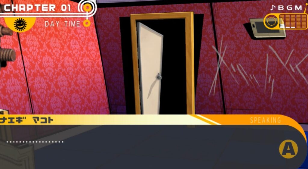 苗木と舞園の扉のネームプレートを調べて、舞園さんの部屋に入る