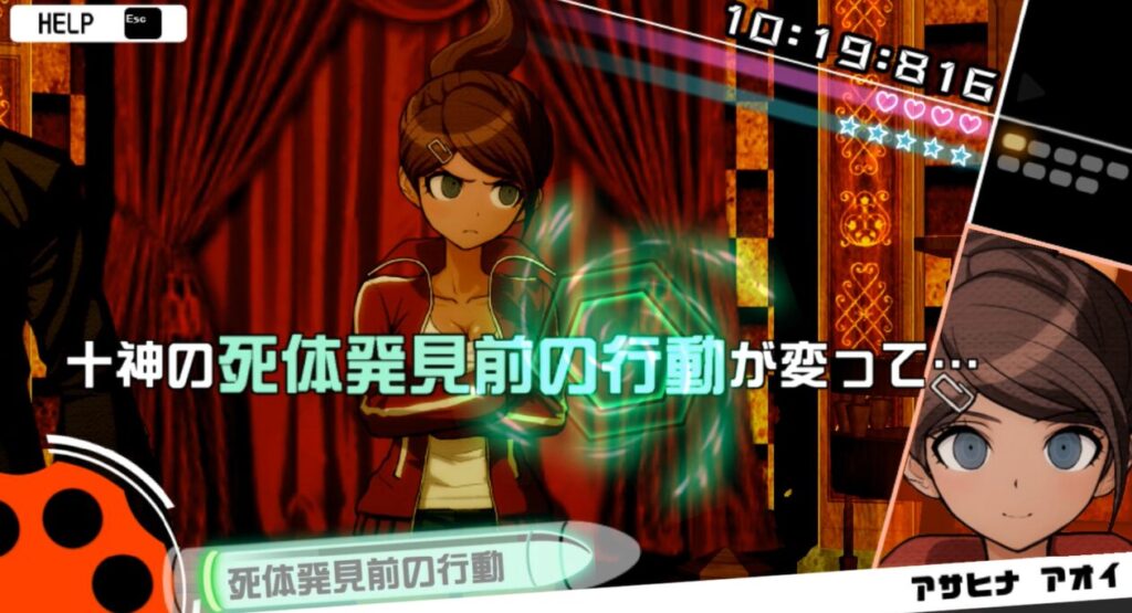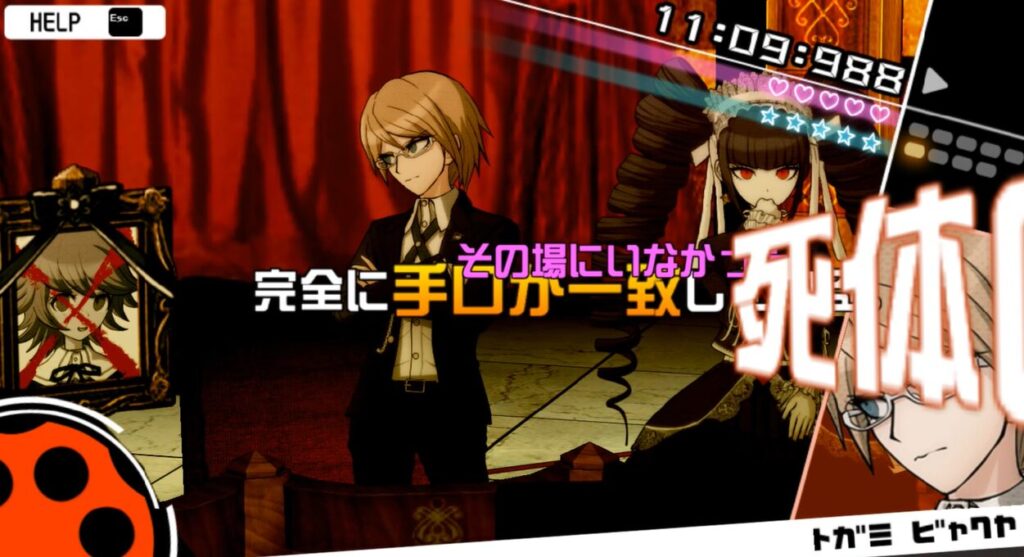 朝日奈の「死体発見前の行動」を言弾として記憶して、十神の「被害者の不二咲」に言弾「死体発見前の行動」を撃つ。