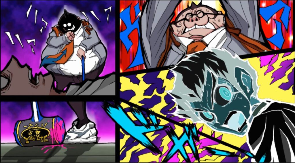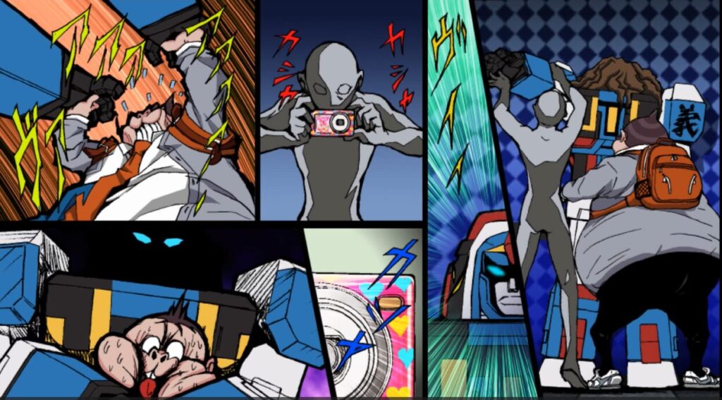 朝日奈の「腰を屈めた体勢」に言弾「ジャスティスロボの衣装」を撃つ。