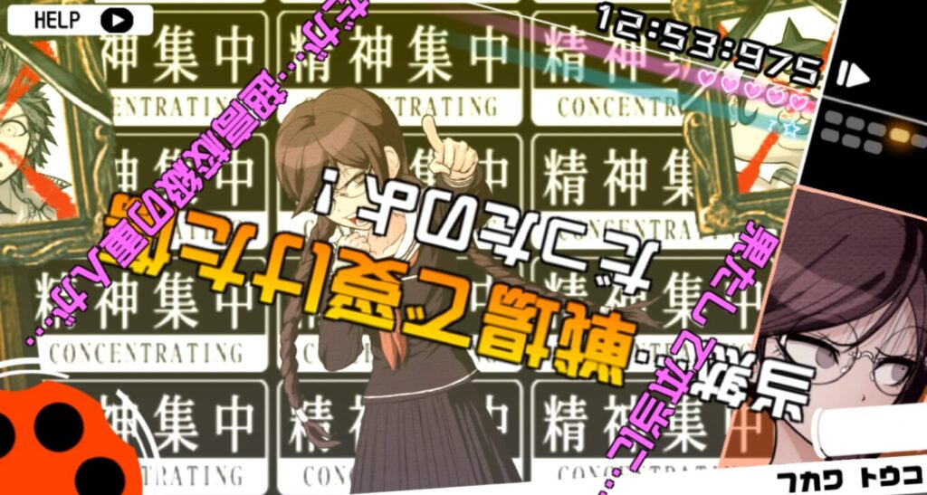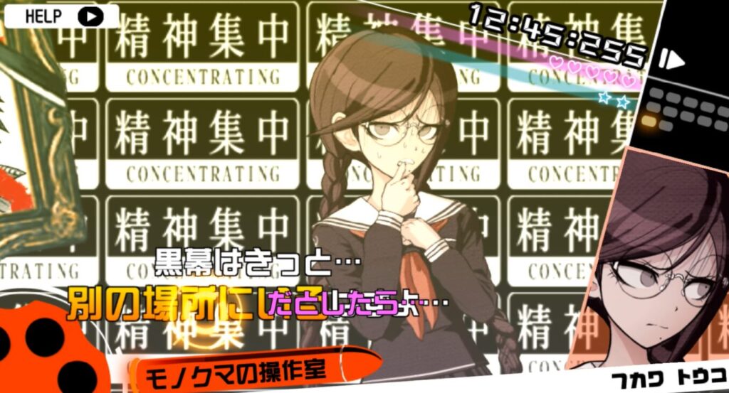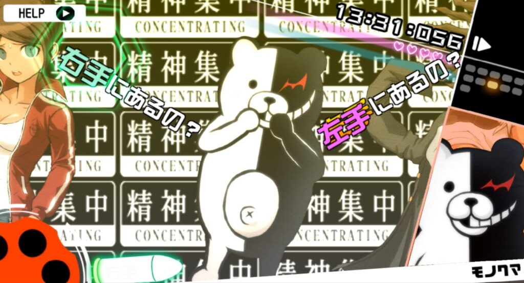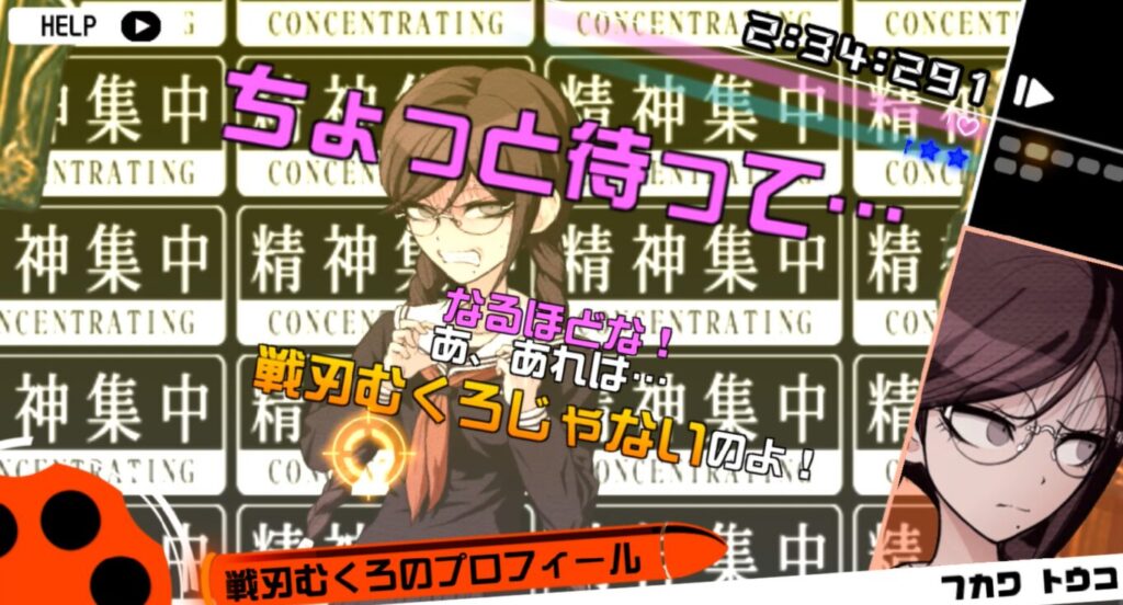 モノクマの「右手」(ピンクの文字)を撃ち落とした後にモノクマの「右手」(黄色の文字)をYボタン長押しで記憶して、モノクマの「正体は戦刃むくろ」を撃つ。