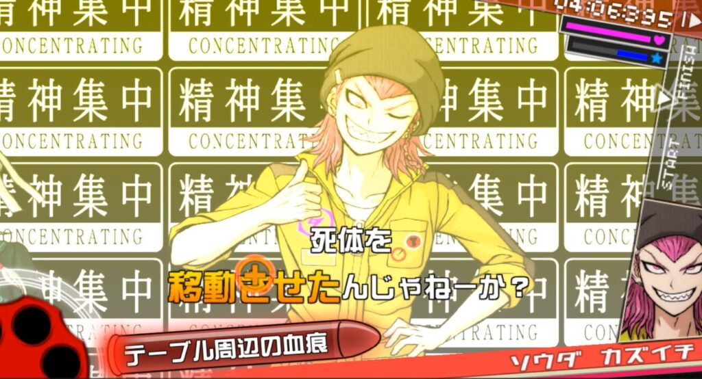 左右田の「移動させた」に言弾「テーブル周辺の血痕」を撃つ。