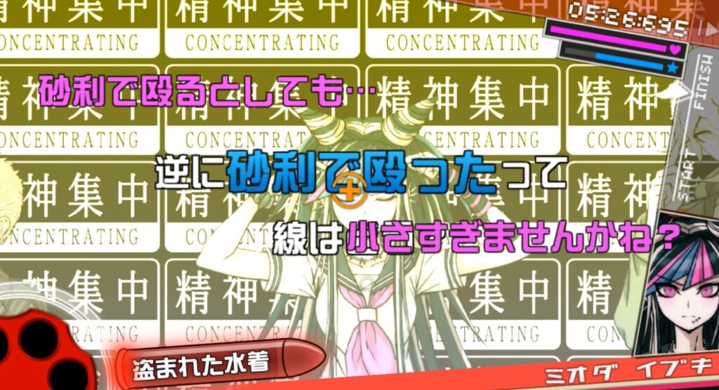 澪田の「砂利で殴った」に言弾「盗まれた水着」を撃つ。
