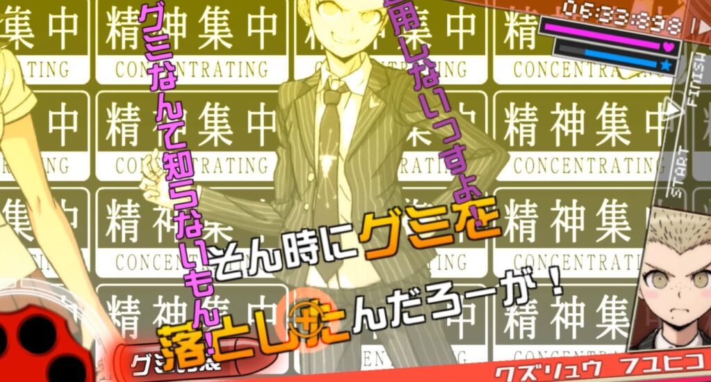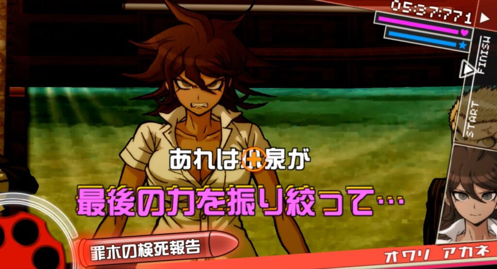 終里の「最後の力を振り絞って…」にピンクの文字が被っているので、Aボタンでピンクの文字を撃ち落としてから、言弾「罪木の検死結果」を撃つ。