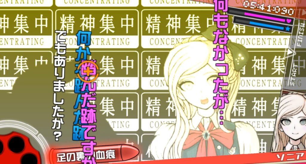 ソニアの「何かを踏んだ跡」に言弾「足の裏の血痕」を撃つ。